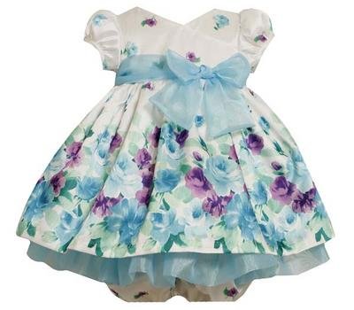 Up for your consideration is this beautiful dress from Bonnie Jean. This short sleeve dress features white shantung fabric w/ flower prints throughout, crossover bodice, turquoise organza all around sash and bow at the waist, fully lined with extra tulle netting with for a little more fullness, turquoise organza fabric pertruding from the bottom for more detail, and zipper back closure. Comes with a matching shantung flower print panty. A spectacular dress that can be worn during Easter, wedding, or any special occasion. Dress is 100% polyester. Bonnie Jean is a great brand sold in high end department stores.