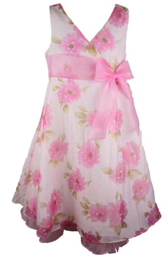 This gorgeous pink floral print dress from Bonnie Jean will make a perfect picture dress this season. The v-neck style dress is adorned with a beautiful pink floral print overlaid on white. The bodice is wrapped in a lovely light pink ribbon that finishes with a bow in the front of the dress. The dress is fully underlined again for comfort and closes with a zippered closure. This dress will make a beautiful girls Birthday, Easter or Mothers Day Dress.