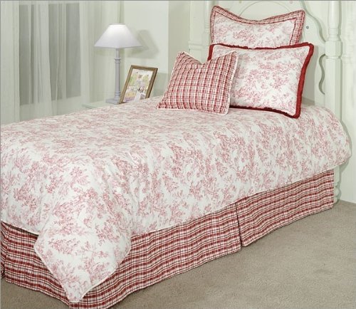 - This Jolie bedding set is designed with a sophisticated currant red and white color scheme that is paired with a classic country check and toile.