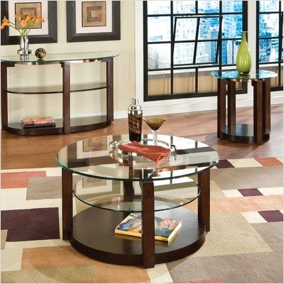 [***INCLUDED IN THIS SET: (1)Coronado Console Table, (1)Coronado Round Cocktail Table in Cherry, (2)Coronado End Table in Cherry] Features: -Contemporary style.-Beveled glass top.-Recessed shelves.-Mimicked design elements.-Round shape.-Surfaces clean easily with a soft cloth. Includes: -Set includes cocktail table and end table. Construction: -Constructed of solid wood and veneers. Color/Finish: -Cherry finish. Assembly Instructions: -Assembly required. Collection: -Coronado collection.