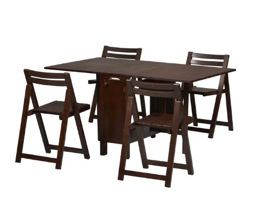 Solid Beechwood and veneer 5-piece Space Saver dining set comes complete with 4 chairs stowed inside! Entertain anywhere by simply lifting the handle and using the back wheel to guide the table to your destination. Both drop leafs easily stay upright when supported by the gate leg that pulls out from under the table. Stores all four chairs inside of the table base for hidden storage. This dining set can seat up to six people comfortably for a meal or game. Table increases from 8"x36" to 36"x60". Features: Espresso finish Solid wood table top Rectangular 5 piece set arrangement Standard height for casual dining Mobile, with casters for easy transportation Drop Leaf Shipped ready to assemble (minor assembly is required) Specifications: Table Open Dimensions: 58"W x 36"D x 29"H Table Closed Dimensions: 13"W x 36"D x 29"H Chair Dimensions: 17.88"W x 20.68"D x 31"H Seat Height: 18" Weight: 135.58 lbs