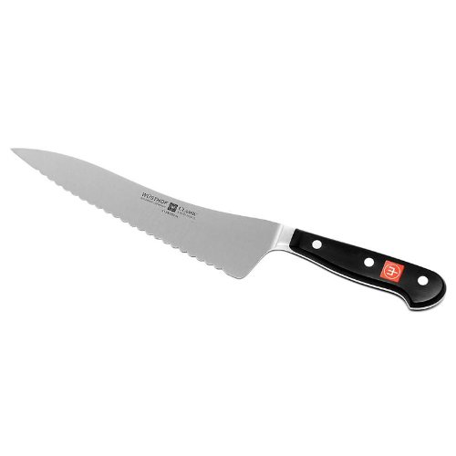 Wusthof Classic 8" Panini Knife The Wusthof Panini Knife combines durable materials with a functional design that is ideal for every day use. Made of stain resistant steel, this forged knife was constructed from solid stainless steel so it offers more durability and flexibility. Using the Precision Edge Technology, this knife was expertly sharpened on a whetstone, and has an optimum cutting edge along the entire length of the blade. A serrated blade makes this knife ideal for slicing breads, baguettes, and sandwiches. The offset handle and uneven edges creates a sawing motion that gives you perfectly cut slices every time. This knife also features a full bolster and tang that extends the blade for easy handling. A black synthetic handle is riveted into the full tang for sturdiness and comfort. This knife is dishwasher safe, however hand washing is recommended to prolong the life of the blade. Features: Stainless steel Forged knife Serrated blade Precision Edge Technology High stain resistance Full bolster / finger guard for safety Black synthetic handle Dishwasher safe, hand washing is recommended Limited warranty